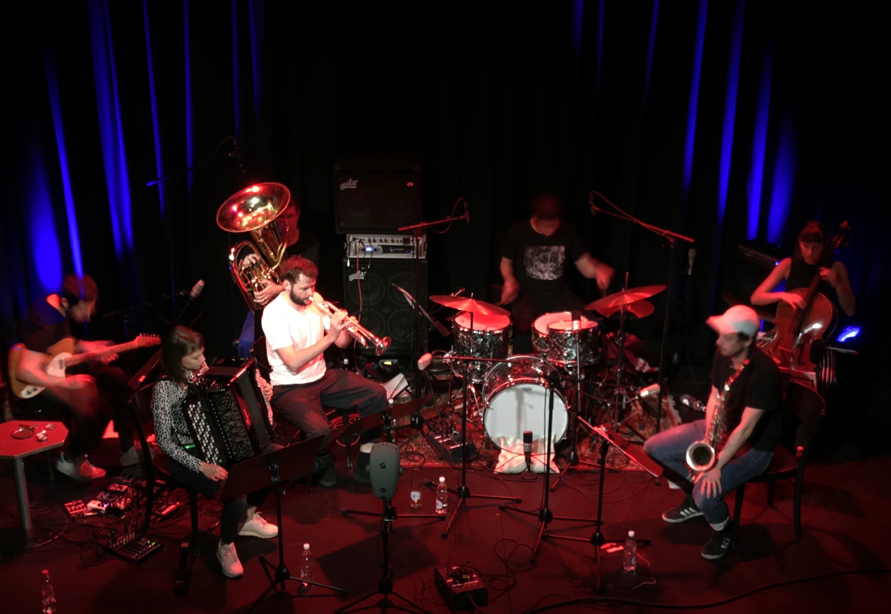 David Meier: drums & compositions Carl Ludwig Hübsch: tuba Elisabeth Coudoux: cello Manuel Troller: guitar Tizia Zimmermann: accordion Elio Amberg: saxophone Silvan Schmid: trumpet |